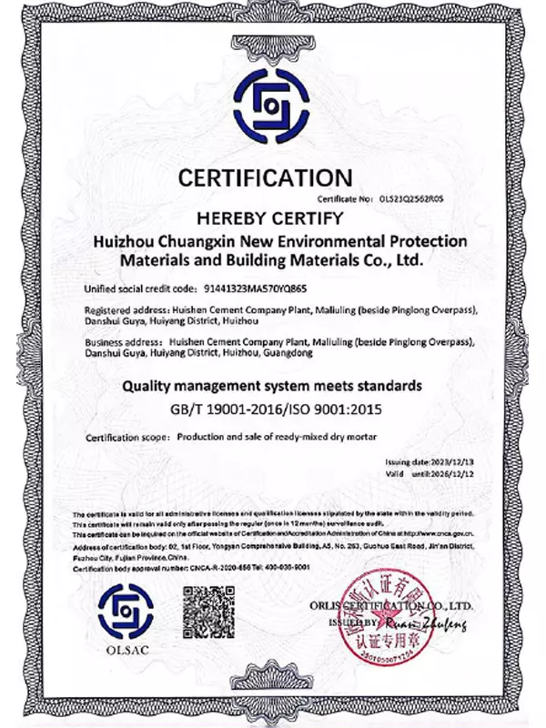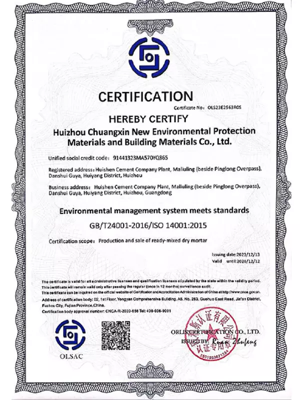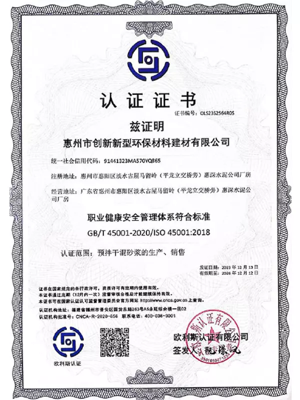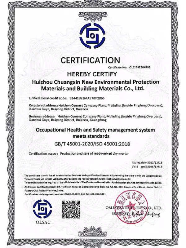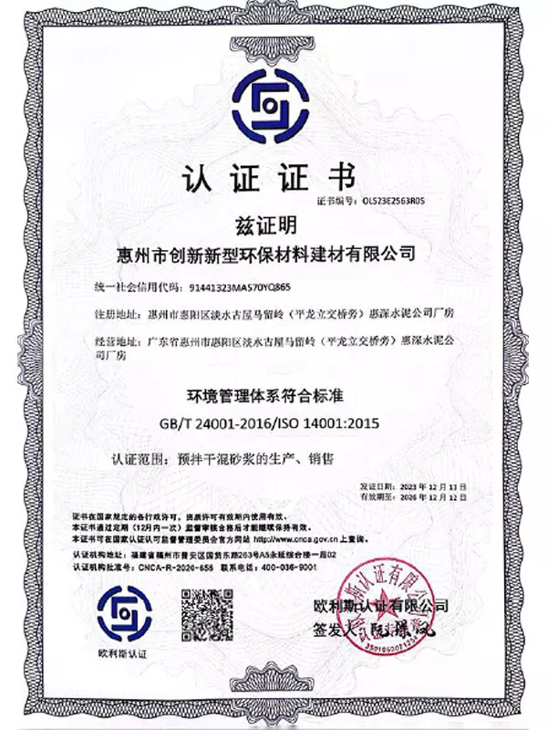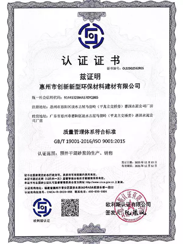 Huizhou Innovation New Environmental Protection Materials Building Materials Co., Ltd. was established on August 20, 2021, with a registered capital of 20 million RMB. As a technology-driven enterprise specializing in new materials, the company integrates R&D, production, and sales. Our ongoing project aims to establish a green new building materials production base dedicated to dry-mixed mortar, scientific research in building materials, market transformation, and promotion applications. This initiative will create a comprehensive industrial chain system that combines R&D, large-scale production, and professional technical services for green new building materials.Our company operates a state-of-the-art dry-mixed mortar production line with an annual capacity of 300,000 tons. Equipped with advanced, stable, and safe dry-mixed mortar facilities sourced from leading Chinese suppliers, the production line ensures high efficiency and reliability. The facility is strategically located at Maluling, Guwu, Danshui, Huiyang District, Huizhou City, Guangdong Province (adjacent to Pinglong Overpass), just 1 kilometer from the Xinqiao exit of the G15 Shenzhen-Huizhou Expressway, ensuring convenient logistics and transportation.