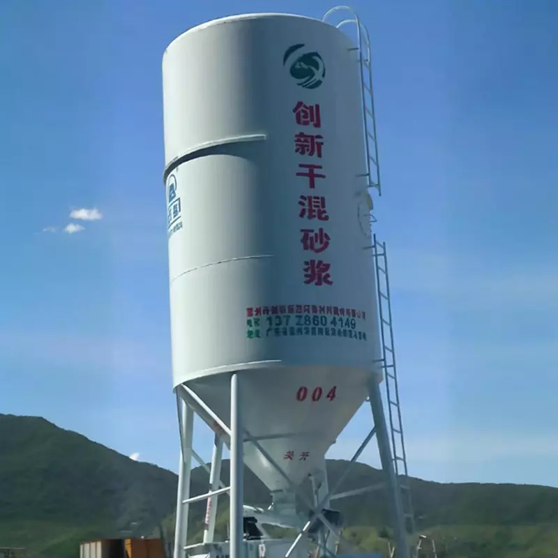 The dry powder mortar storage tank consists of two parts: the back tank and the mortar mixer. The storage tank is composed of the tank body, feeding pipe, anti-segregation device, dust collection system, exhaust pipe, manhole cover system, weighing material level, back tank device, and material balance device, etc. The mortar mixer is composed of feeding and stirring, water addition and electrical control system. When in use, first transport the sand storage tank to the construction site. Then, the mortar transport vehicle conveys it to the interior by pneumatic force. Connect the power supply to the mortar mixer and connect the water source at the water inlet. Press the start button to start production.